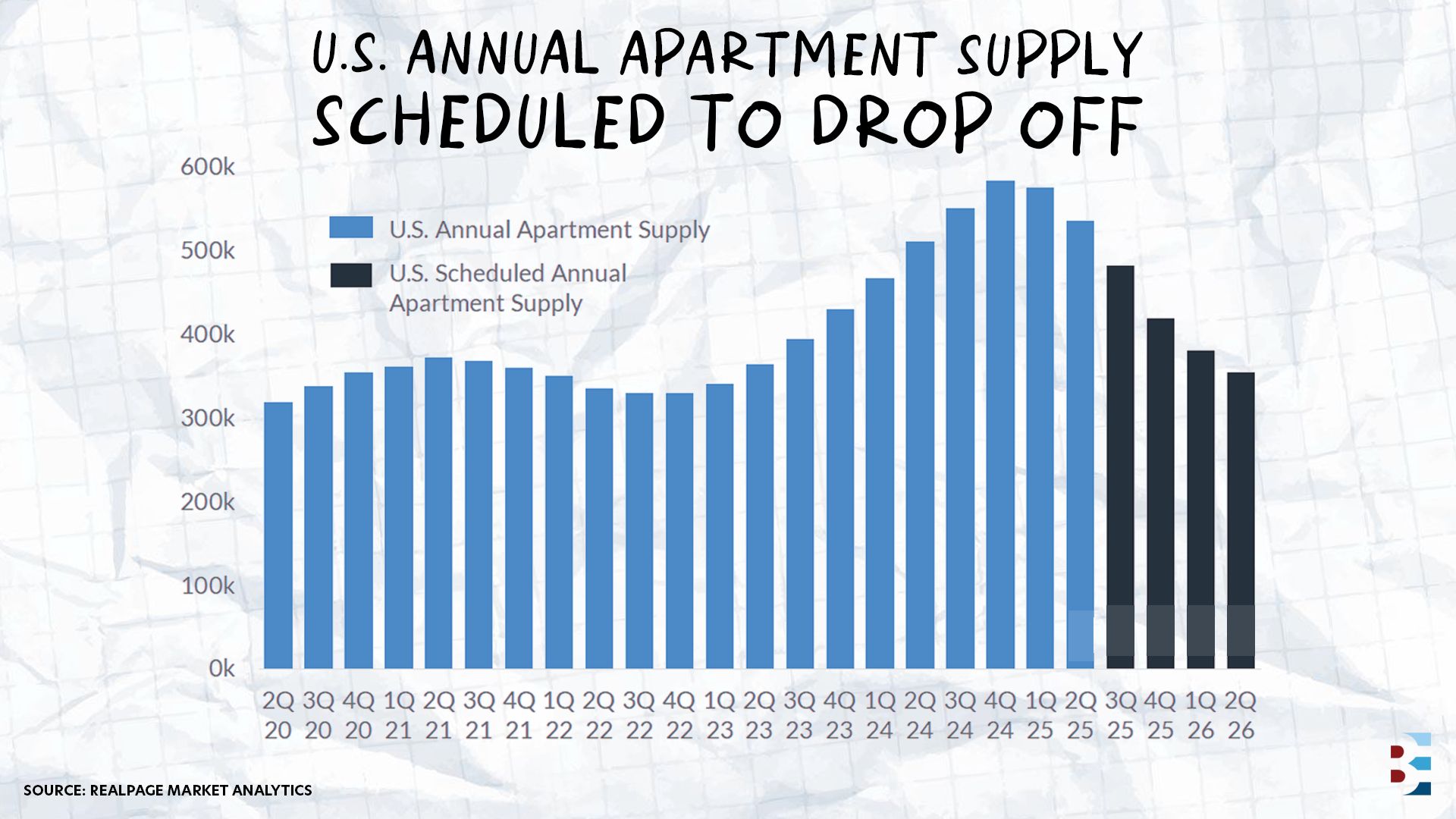 U.S. apartment deliveries are set to drop 33.9% over the next 12 months as developers pull back from the elevated construction volumes of recent years, according to RealPage. This return to normal supply levels will affect most major markets, but 10 of the nation's 50 largest apartment markets are scheduled to see delivery increases.