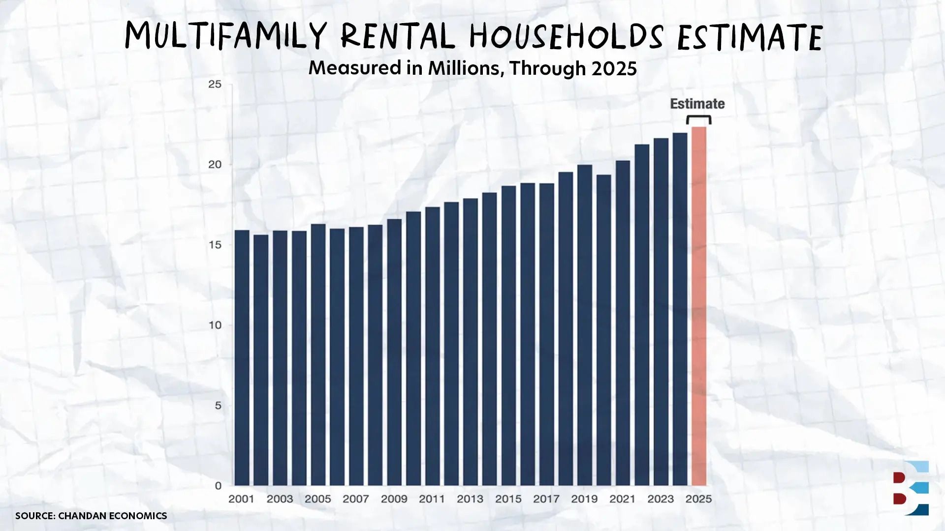 U.S. multifamily rental households reached an estimated 22 million in 2024, the highest level on record, with projections pointing to 22.4 million in 2025. The five-year gain of roughly three million units marks a 15.4% increase, the largest jump in more than two decades.