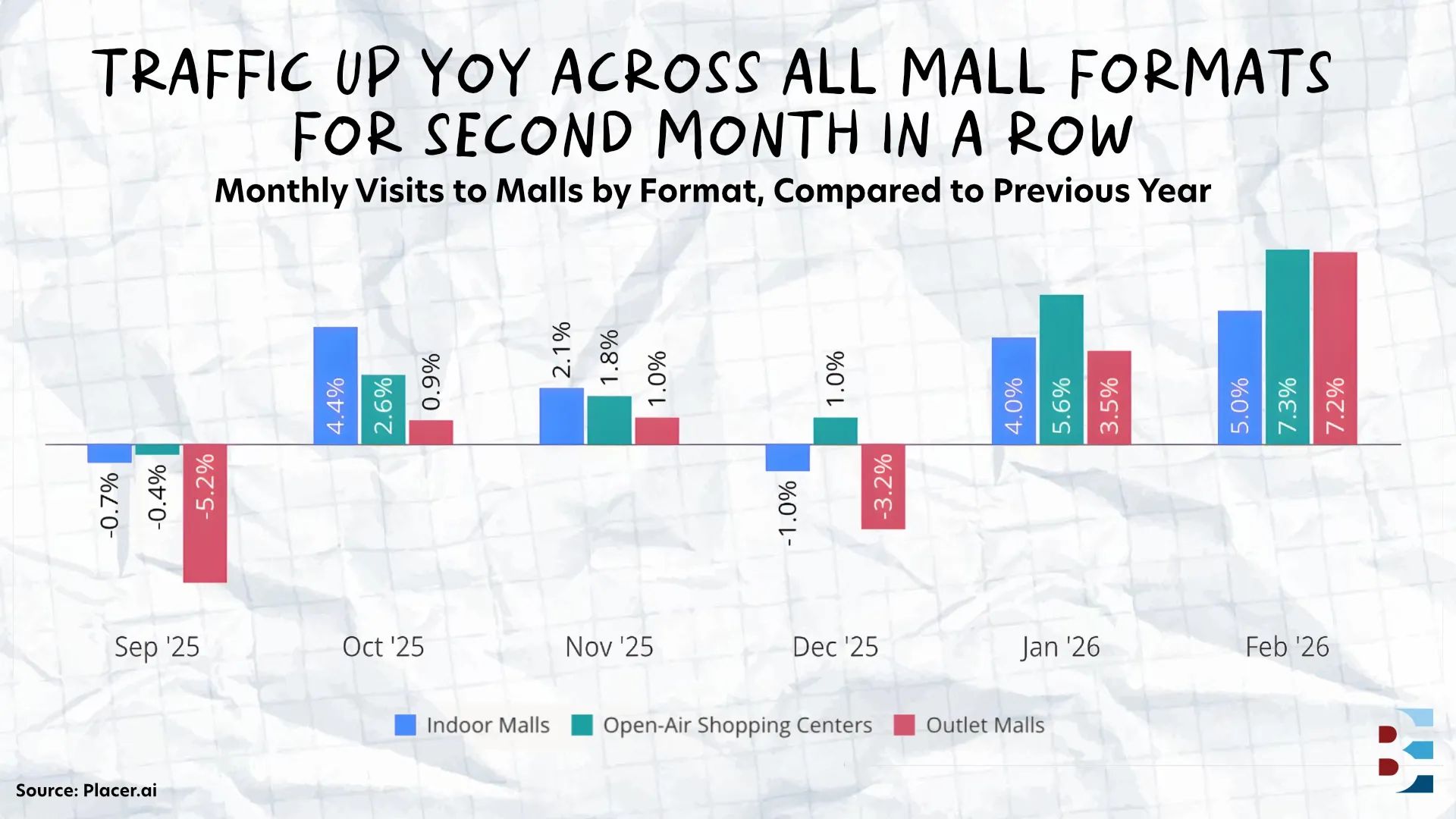 Shopping centers extended their growth streak in February, with all three formats — indoor malls, open-air centers, and outlet malls — posting YoY visit gains, according to the Placer.ai Mall Index.