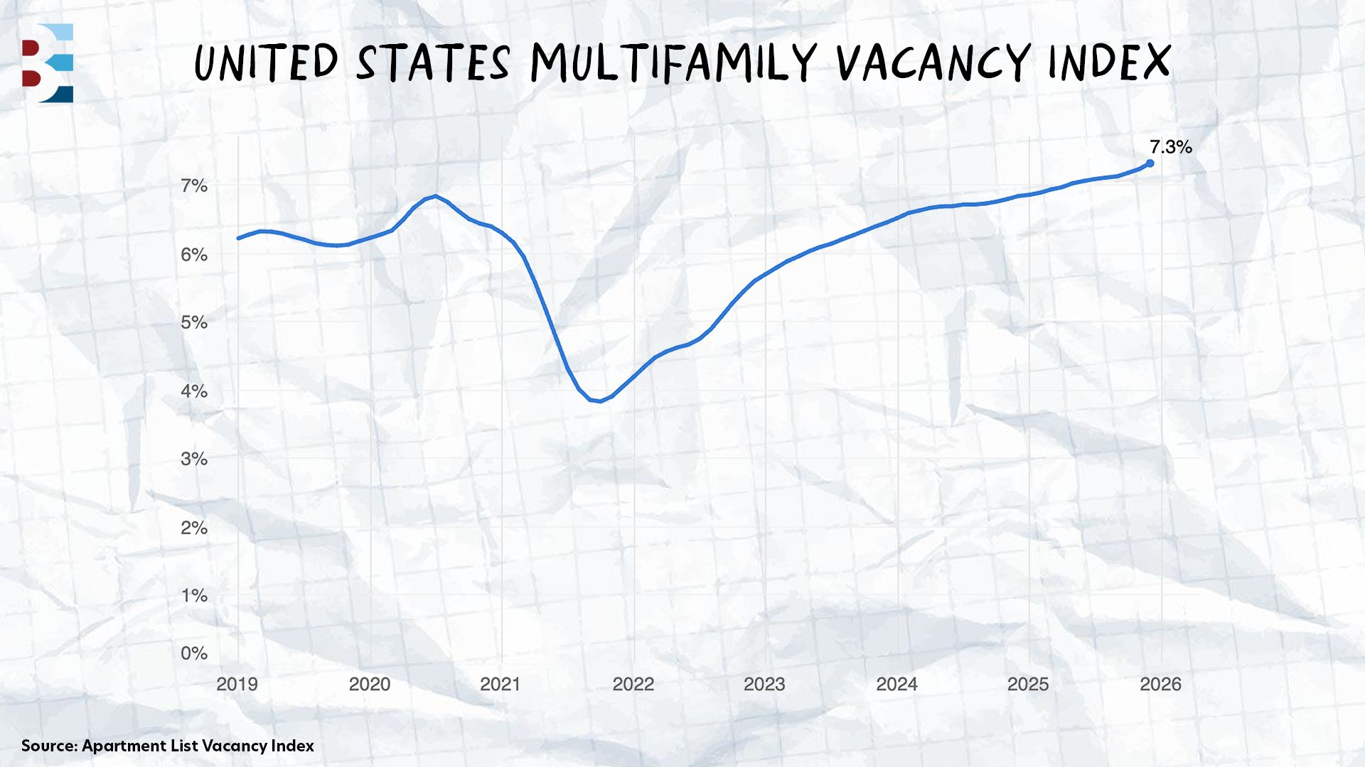 National multifamily vacancy hit a record 7.3% in December as the market continues absorbing supply from 600,000 units delivered in 2024, the most since 1986. Units now take 39 days to lease after listing โ three days longer than last year and another record high dating back to 2019.