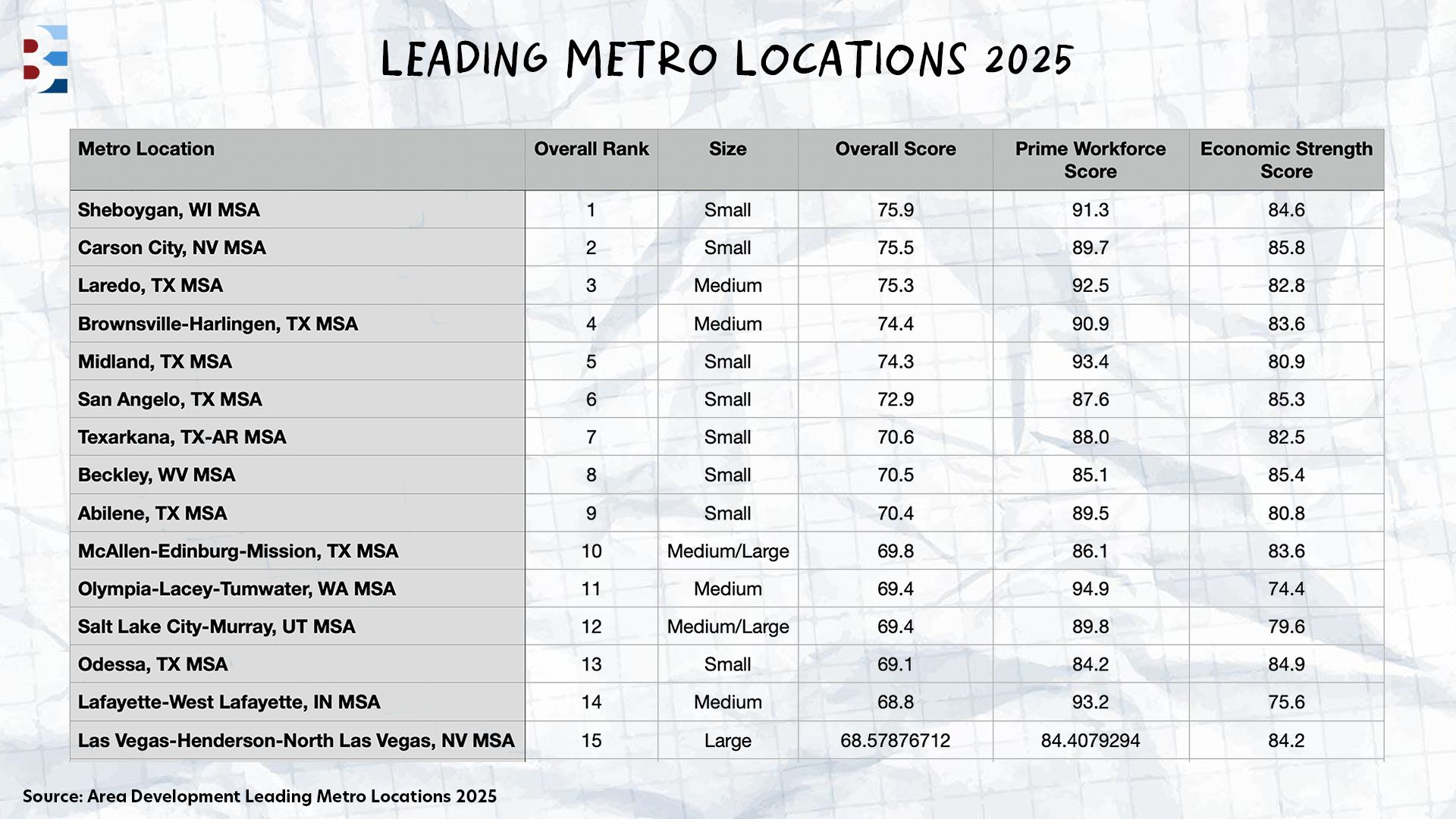 Across 949 ranked U.S. metros on Area Development Magazineโs annual list of top metro locations, smaller and mid-sized metros are dramatically outperforming major cities, while large metros show far less variability in competitiveness. The highest performers share common characteristics: workforce agility over workforce size, housing affordability over amenity density, and infrastructure adaptation over legacy systems.