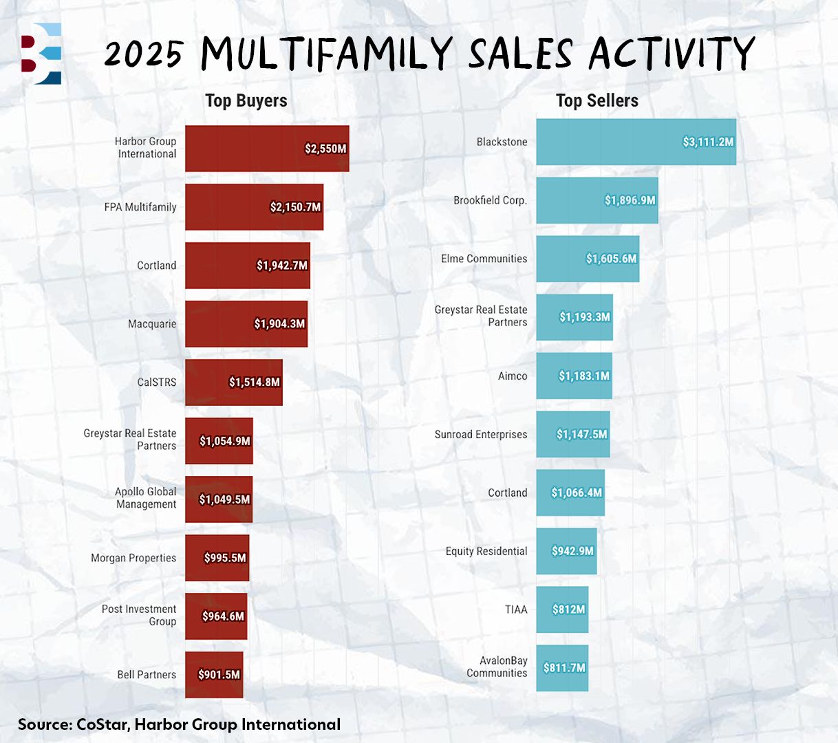 Harbor Group International led all multifamily buyers in 2025 with $2.5 billion in acquisitions, including a $740 million purchase of five New England properties and a $625 million Sun Belt portfolio deal, as investors deployed $115 billion total across the sector.