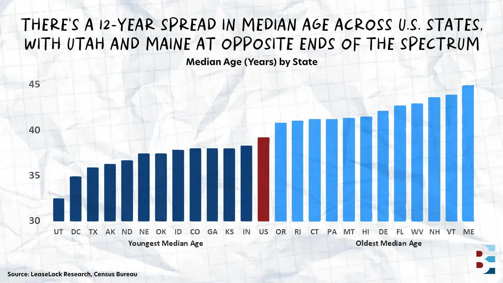 The gap between the nation's youngest and oldest states now spans more than a decade. Utah's median age sits at 32.5; Maine's is nearly 45. That spread matters because young singles living alone still account for an outsized share of the renter base β making state-level age a rough but useful proxy for household formation depth and, by extension, demand for both new and existing apartment stock.