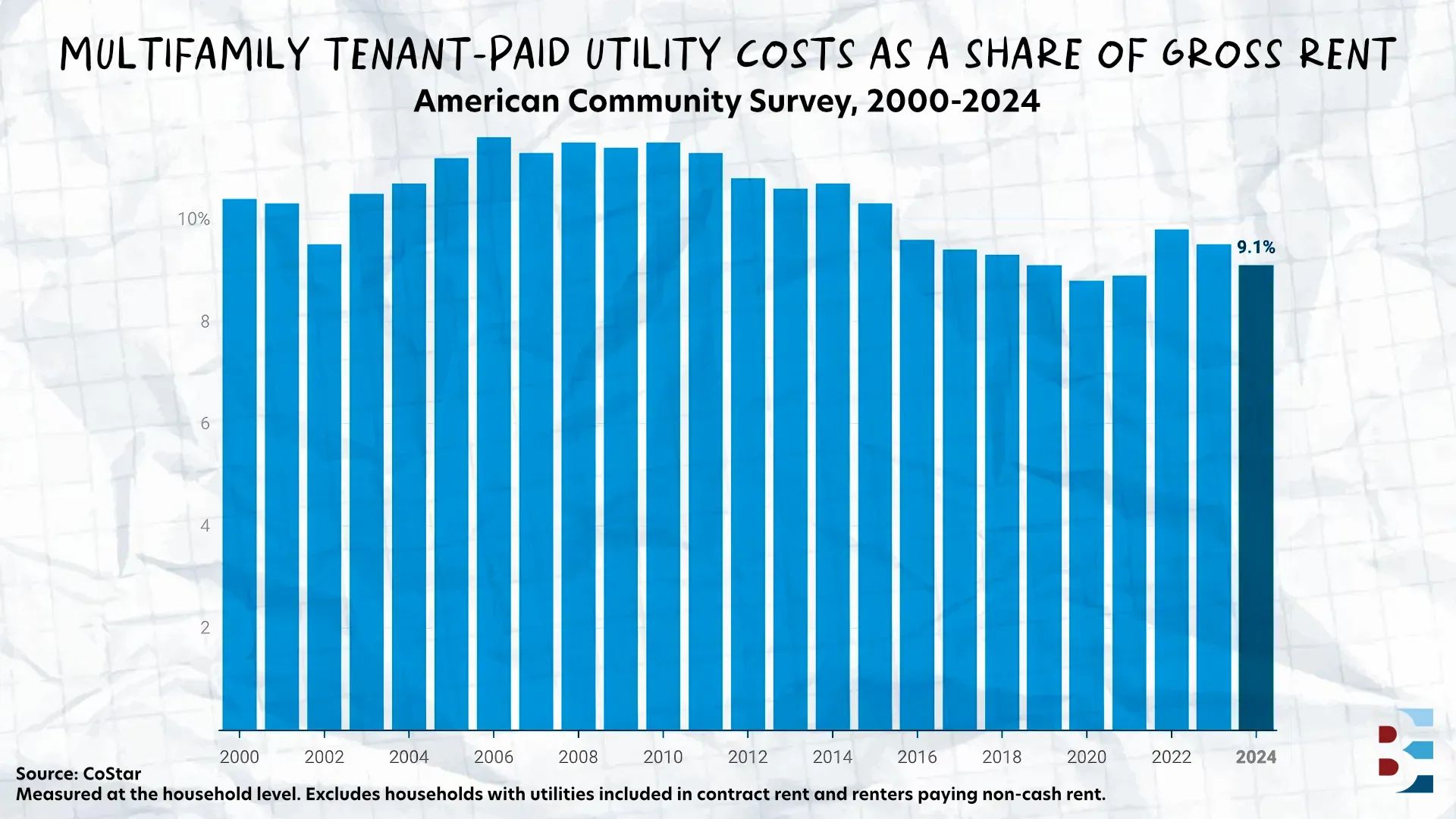 Multifamily utility costs have fallen from as much as 11.6% of gross rent in 2006 to 8.8% by 2020, according to Chandan Economics, driven by the U.S. shale boom, rising rents, more energy-efficient construction, and Sun Belt migration β a structural shift industry observers expect to hold.